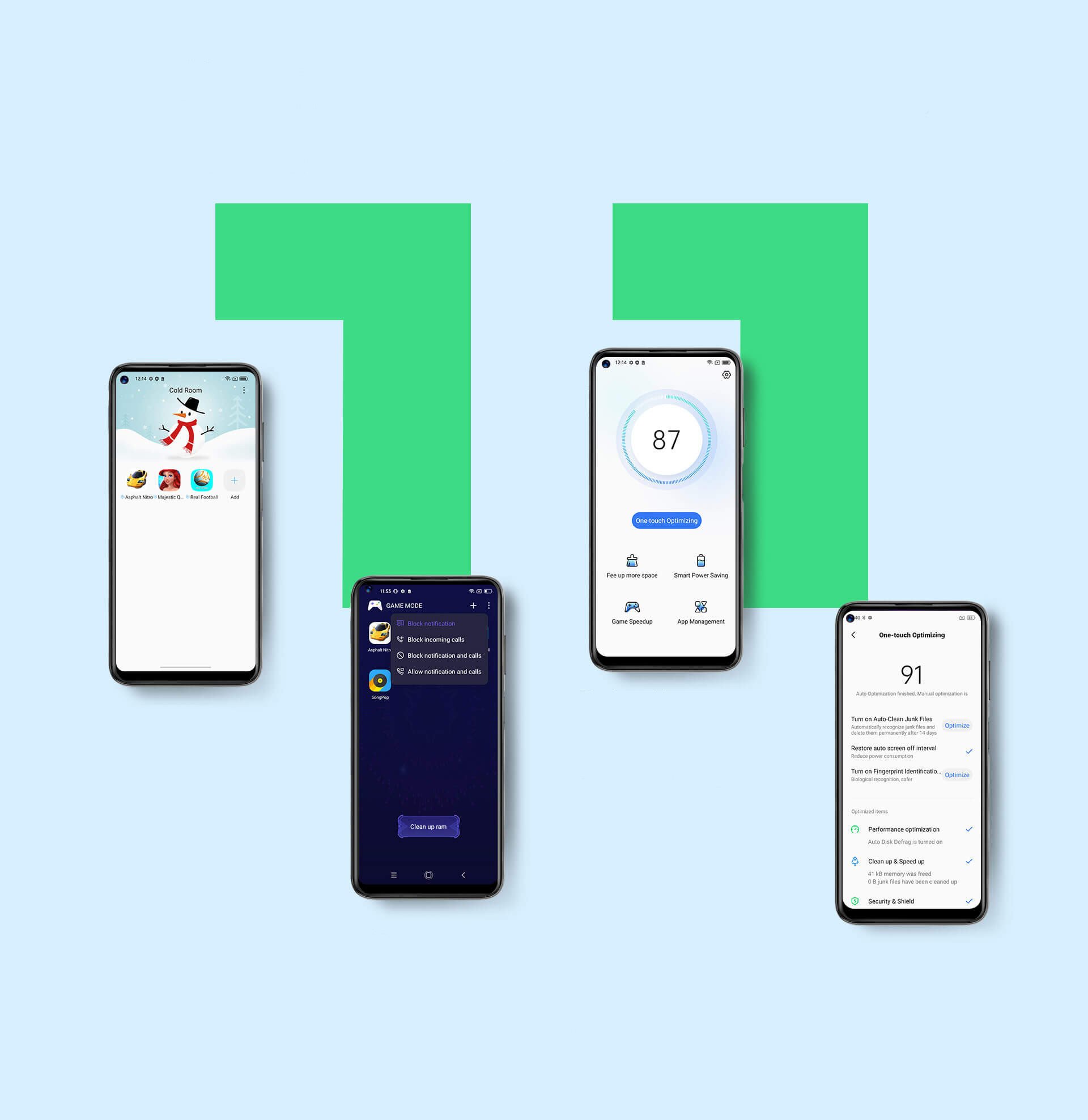 Получите полный контроль к очищению памяти, аккумулятору, производительности в играх и фоновым приложениям.